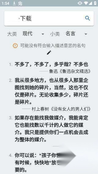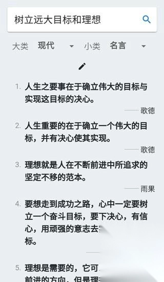 3、若在搜索框内输入“树立远大目标和理想”,接着在“大类”选项里选择“现代”,“小类”选项中选择“名言”,完成搜索操作后,就能获取歌德、雨果、鲁迅等国内外知名人士关于“目标”与“理想”的相关名言。