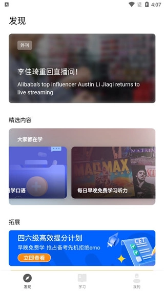 兴趣学习板块涵盖了有声读物、名人演讲、公开课、少儿英语、影视英语等多种丰富资源。