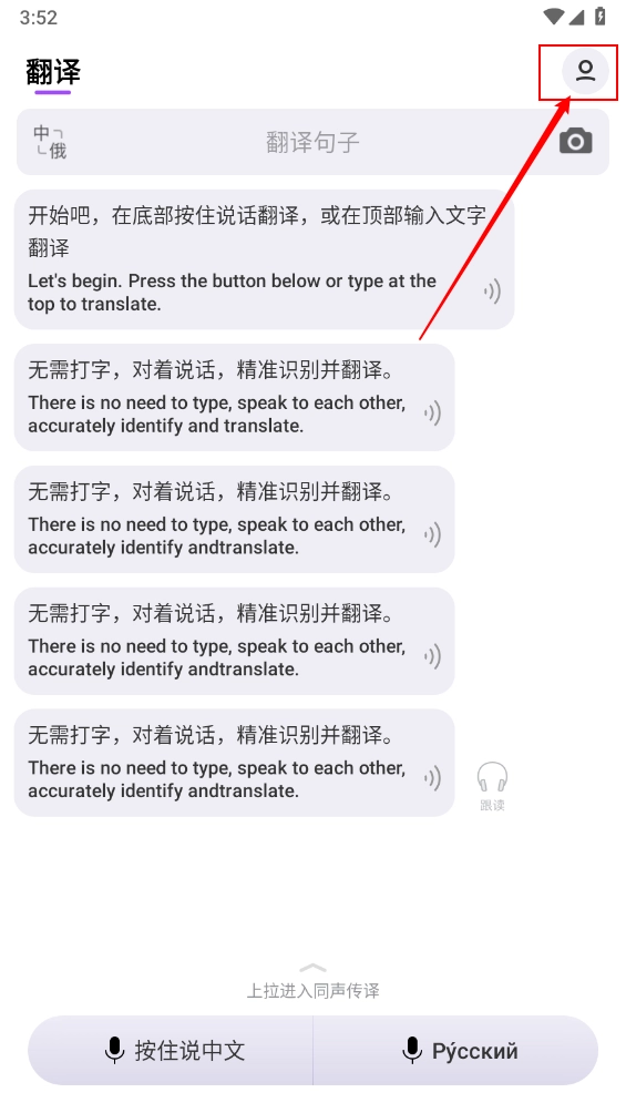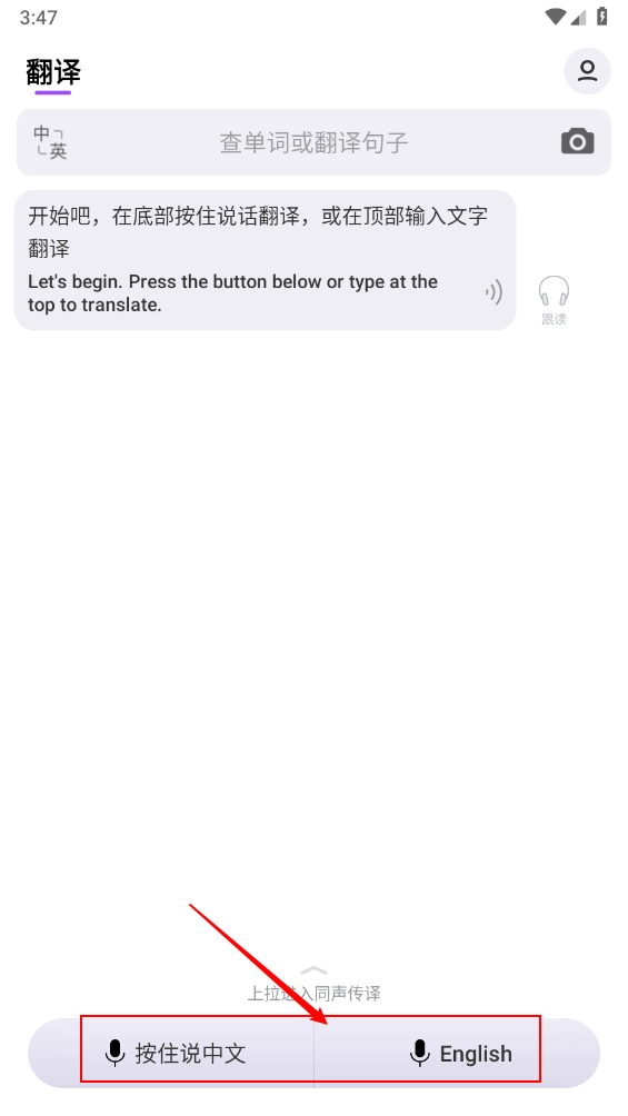 2、进入主页,点击"按住说中文"即可进行语音翻译。