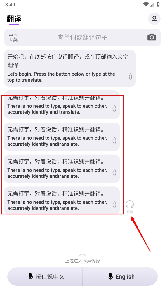 4、翻译完成后就能查看翻译好的句子,还可以点击“跟读”按钮。