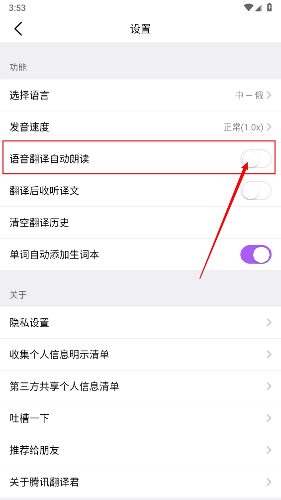 3、进入后开启"语音翻译自动朗读"的开关即可。