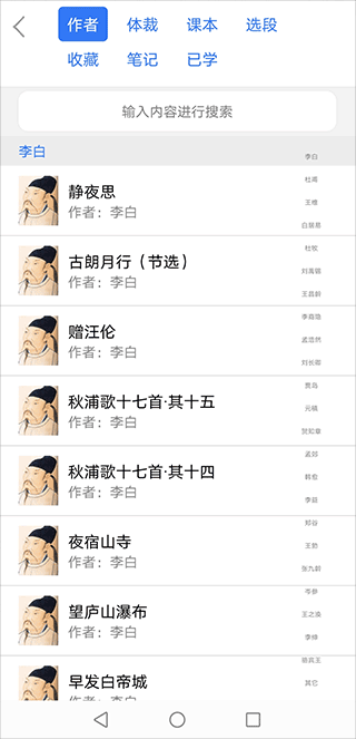 3、同一界面左下角红色方框里的按钮,对应的是著名诗人和词人的古诗词合集。