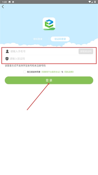 4、切换到验证码登录模式后,填写【请输入号】,点击【获取验证码】并输入收到的验证码,勾选相关协议后点击【登录】按钮,即可完成登录操作。