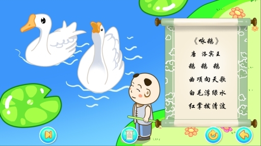 3、以《咏鹅》为例,在画面的左下角可点击切换至下一首,右下角设有重读按钮和返回主界面的功能