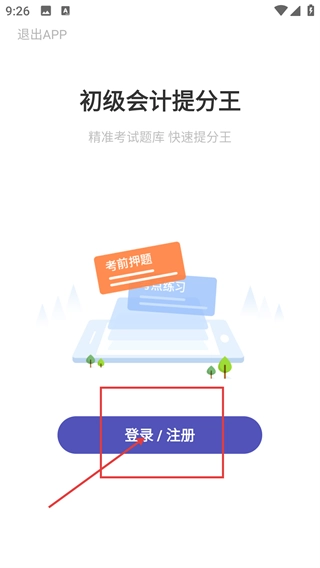 1、打开【初级会计提分王】,点击【登录/注册】按钮,进入登录流程。