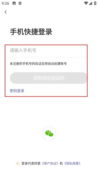 2、在【快捷登录】页面,输入号码,点击【获取短信验证码】,若为未注册号码,验证后将自动创建账号。