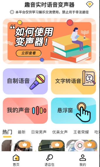 1、打开趣音实时语音变声器后,在首页能看到各种各样的功能。