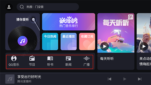 1、完成后就能直接运行使用,在主界面里就能看到包含QQ音乐、科目、听书、新闻、广播等在内的功能选项