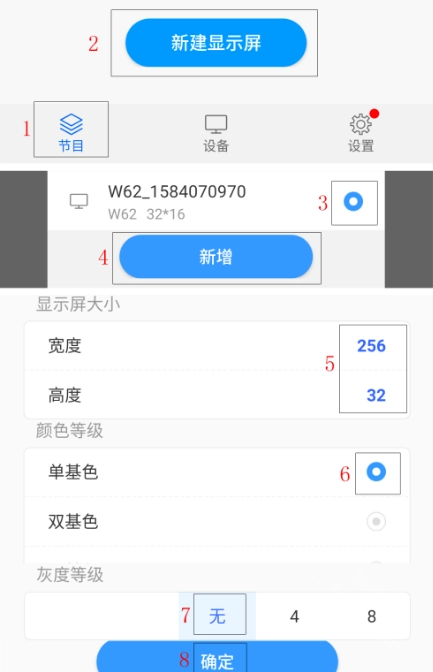 3.在屏掌控左下角,点击“节目”选项,接着选择“新建显示屏”,然后选中对应的设备,点击“新增”按钮,之后设置屏幕的宽高参数,再选择所需的颜色和灰度,最后点击“确定”即可。