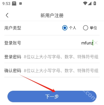 2. 接着选择用户类型,若是个人用户就选“个人”,非个人用户则选“单位”;之后输入账号、密码和确认密码,点击“下一步”,最后按照提示完成后续操作即可。(注意:密码需满足8位及以上,且包含大小写字母、数字和特殊符号的组合)