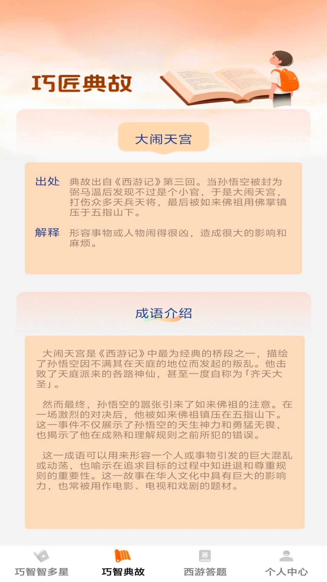 “巧智智多星”是一款旨在提升思维能力与文化知识储备的学习类应用。其巧智智多星模块设有反应力训练和歇后语训练功能,助力用户加快思考节奏,同时支持成语检索以强化词汇积累;巧智典故模块则带领用户探寻成语背后的故事渊源,深化文化认知;西游答题模块借助以西游为主题的答题互动,丰富用户的历史知识与传统文化理解。