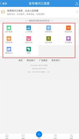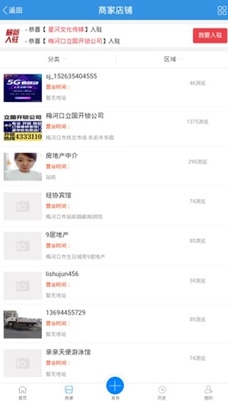 1、在本站梅河口信息网,能看到首页、商家、发布、历史、我的这五个板块。