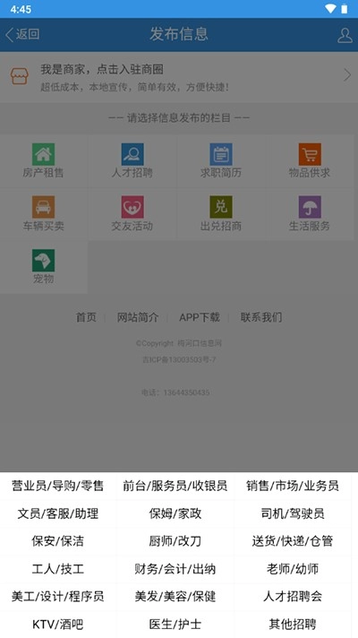 2、首页提供人才招聘、求职信息、房产租售、物品供应、车辆买卖、生活服务等多种服务。