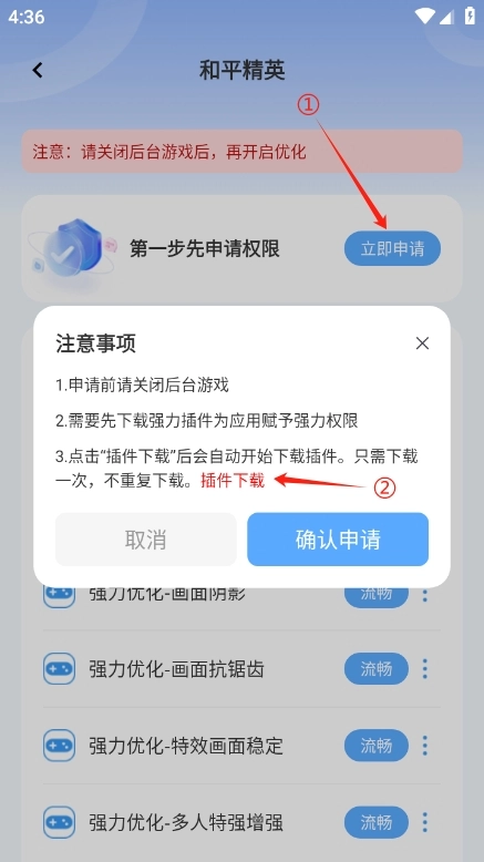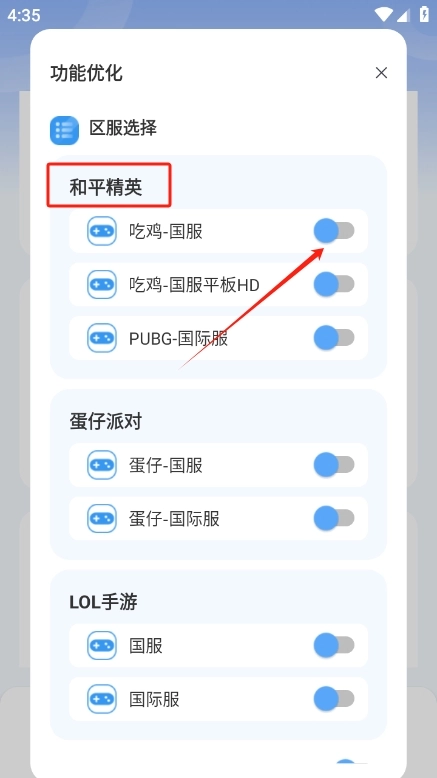 4. 从选项里挑选出希望进行优化的项目以及对应的区服,这里以和平精英作为例子。