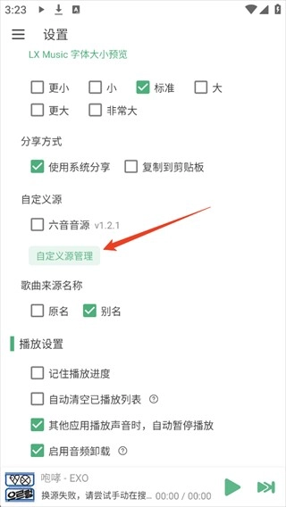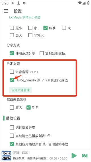 5、导入完成后需要在自定义源处勾选上导入的音乐源,完成以上操作后就可以正常播放音乐了。