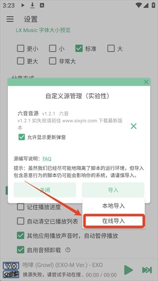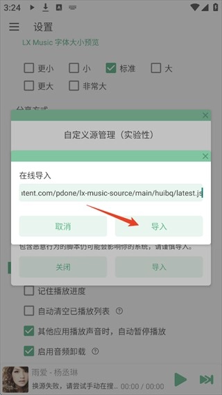 4、复制以下音乐源地址链接粘进入,点击导入等待显示导入成功,如多次尝试此链接无法导入请在下方评论留言等待管理员处理。