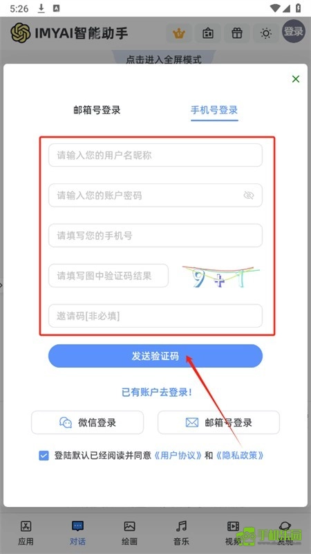 4、依次填写账号、用户名与密码等相关信息后,点击“发送验证码”按钮,待获取验证码并输入后,就能完成注册并成功登录。
