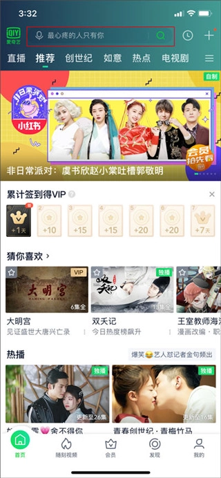 1、进入,就会看到首页、随刻视频、会员、发现、我的五个板块,在首页中有着