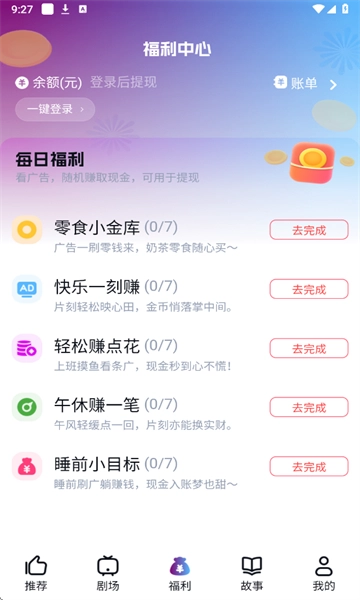 3、您可以通过签到、看电影等途径获取现金福利,提现的金额会马上存入您的账户。