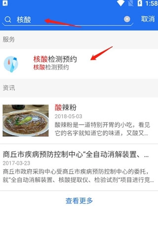 3、在搜索框中输入“核酸”进行搜索,接着点击核酸检测预约选项。