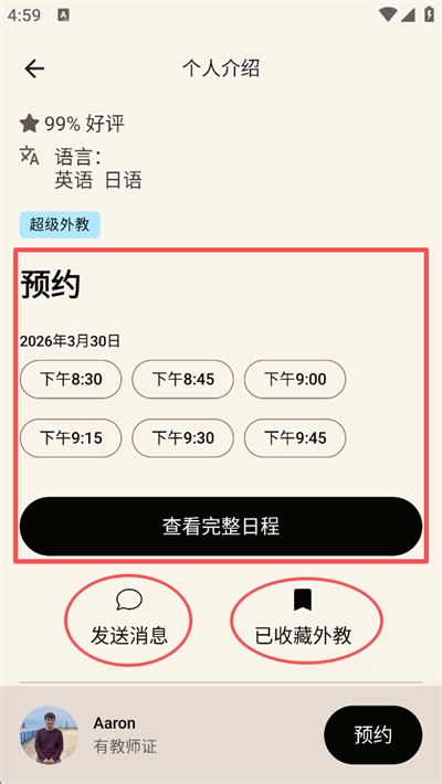 4、点击目标外教,进入其个人介绍页面,查看评价、可用时间、擅长领域等信息;