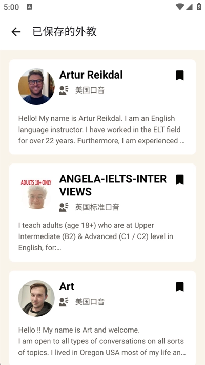 2、外教团队多元化:Cambly的外教均来自英国、美国、澳大利亚、加拿大等英语国家,他们的背景十分丰富多元,涵盖了持有专业教学资质的全职外教、雅思考官、大学面试官、美国飞行员、英国歌曲创作者以及大学细胞生物学教授等不同领域的人才。