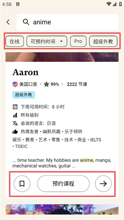 3、筛选符合需求的外教:可以通过选择“在线”状态、“可预约时间”、“Pro/超级外教”等标签,来缩小匹配范围;