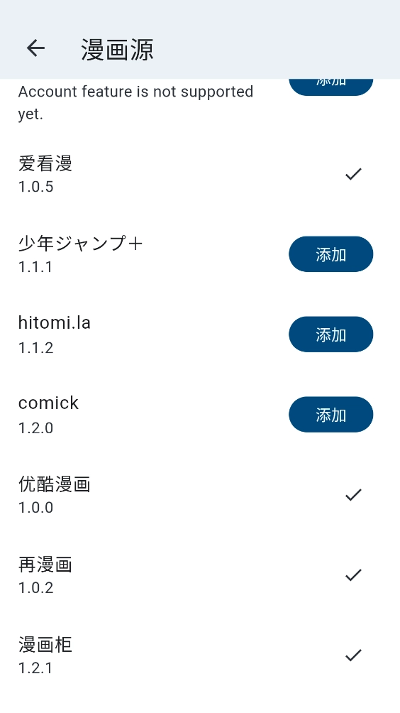 3、接着等待页面刷新,就能看到各类漫画源,选择并点击“添加”按钮。