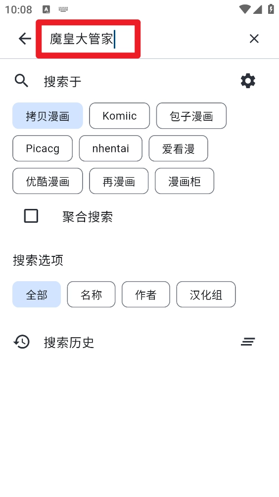 3、然后输入漫画名称进行搜索,支持选择搜索的平台和选项。