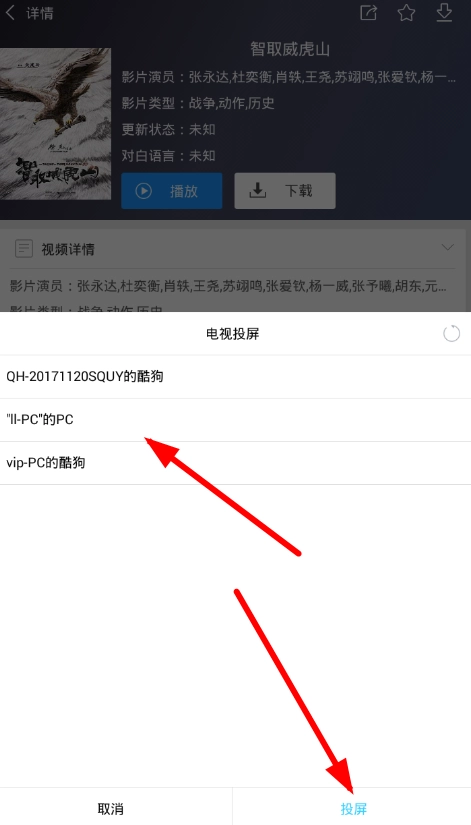 2、这里以“智取威虎山”为例,点击进入播放页面后,选择其中的“电视投屏”选项,接着在上方点击“播放”按钮,搜索并连接你想要投屏的设备。