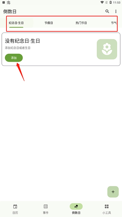 2、支持添加纪念日、生日、节假日、热门节日等各类倒计时,设置完成后点击添加按钮即可。