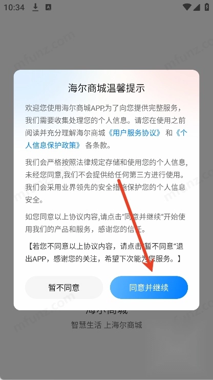 1、先打开海尔商城点击同意并继续