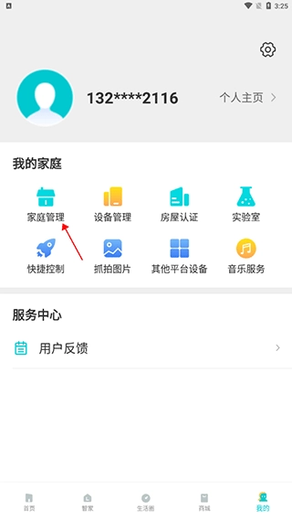 1、在本站点击打开,完成注册登录后,进入“我的”界面并点击“家庭管理”选项。