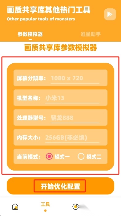 4、还能借助参数模拟器功能来优化,把自己设备的参数设置填写完毕后,点击“开始优化配置”按钮就行。