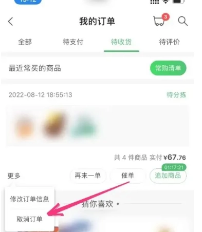 2、在待收货订单中,点击对应订单右侧的“更多”选项,选择“取消订单”。