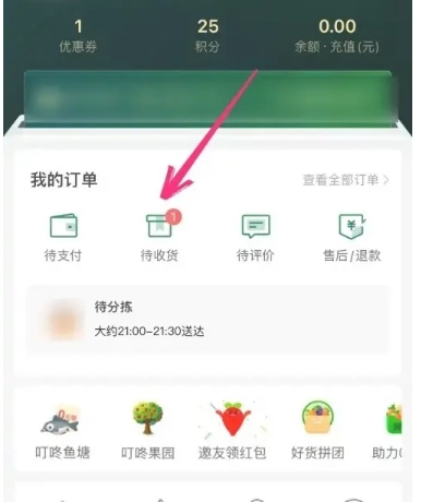 1、打开叮咚买菜,进入“我的”页面,点击“待收货”查看相关订单。