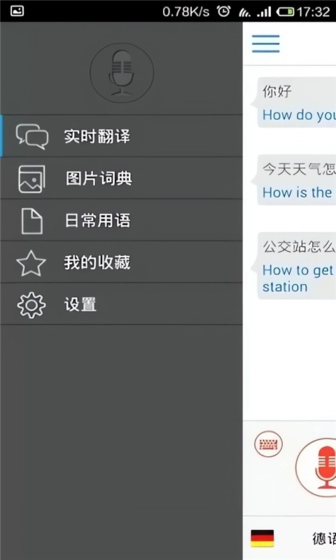 4、手指向屏幕右侧滑动,就能调出选项菜单。不过每次都得通过这种方式调出导航才能切换到其他页面,没有直接的页面选择功能,操作上略感繁琐,习惯后会好一些。从下方可以看到,除了翻译功能外,还有很多其他实用功能。