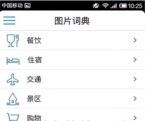 5、先看看图片词典,可以看到餐饮住宿交通景区购物的选项,这些都是挺有用,旅游平常会用到的。