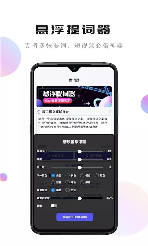 1、【悬浮提词模式】开启悬浮提词智能拍摄功能,可搭配任意拍摄场景使用,无需依赖多个提词工具,也不必购置价格高昂的提词设备。