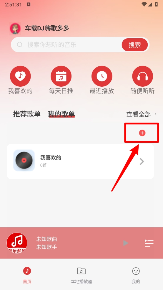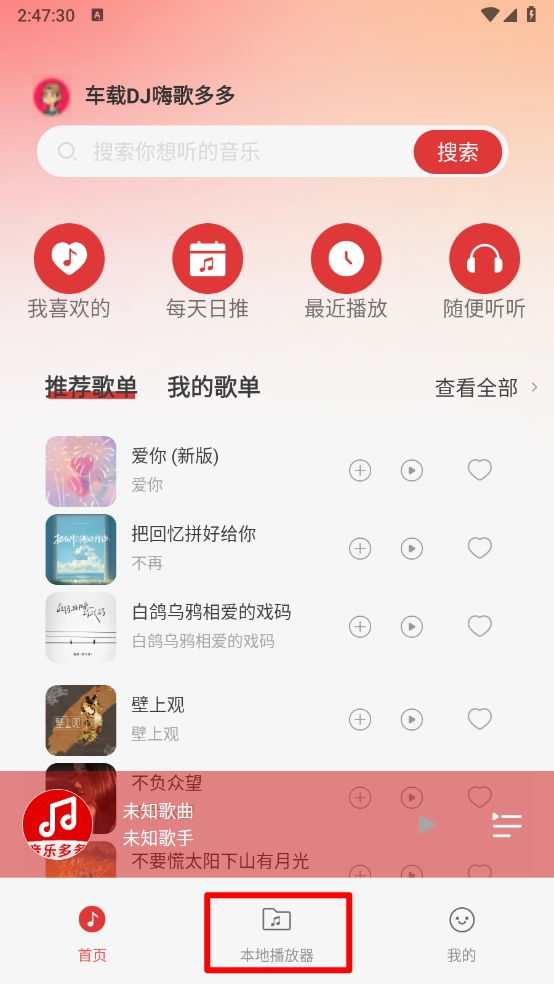 1、打开车载DJ嗨歌多多应用,在首页点击“本地播放器”选项。