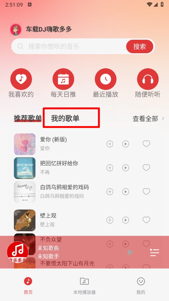 1、智能音乐搜索功能,用户能够在本地音乐库内输入音乐名称、歌手名字或者风格类关键词,迅速找到对应的DJ音乐。