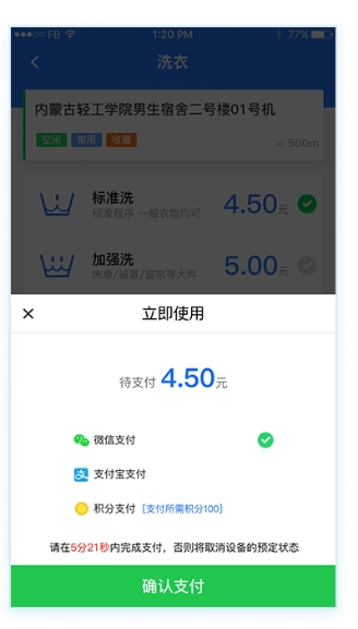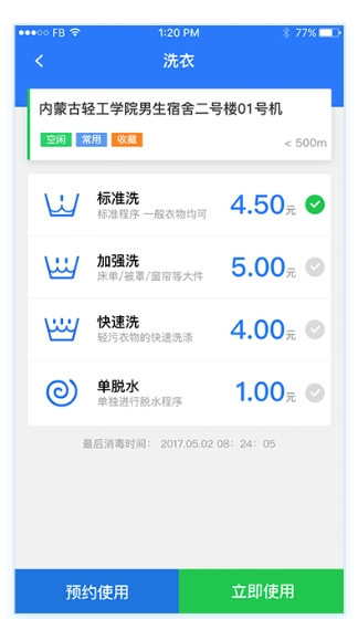 2、自助洗衣系统:支持在线预约洗衣机,若用户未及时使用,系统将在15分钟后自动取消预约,防止设备被长时间占用。