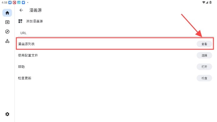 2、再点击漫画源列表后面的查看;
