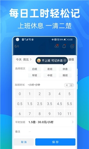 标准工时、小时工、综合工时等多种工时记录方式都能覆盖,工时制度可轻松切换,满足不同蓝领的各类工时记录需求。首次使用时只需输入基本工资与考勤周期,系统就能自动为用户计算出不同时段的加班收入。安心记录加班情况、智能记录工时数据、自动核算工资数额、掌上完成考勤流程,彻底摆脱纸笔依赖。实现全智能的加班记录与统计。