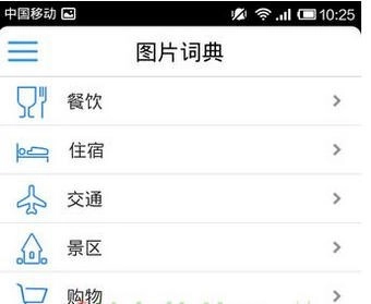 先看看图片词典,可以看到餐饮住宿交通景区购物的选项,这些都是挺有用,旅游平常会用到的。