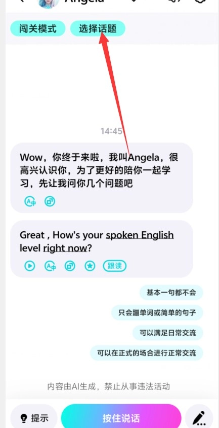 第二步:选择你日常喜欢聊天互动的话题,来和ai机器人聊天互动。