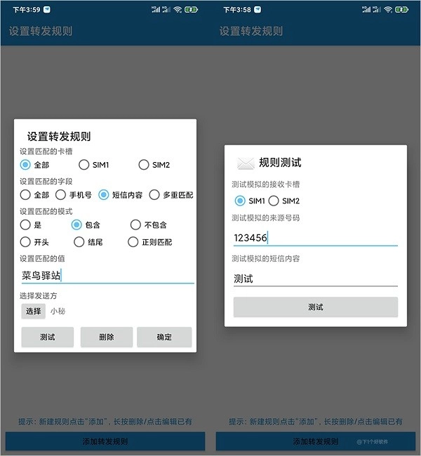 为了能正确的转发短信内容,你可以先点击测试下,随便输入短信内容、号码来源。
