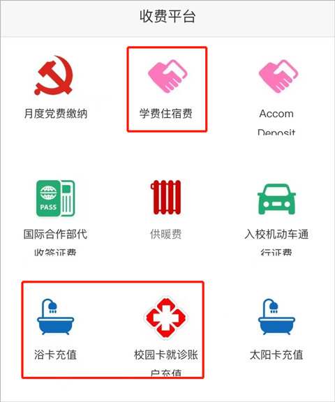 点开“收费平台”,就能看到一系列收费相关的服务,其中我们日常使用频率最高的是“浴卡充值”和“校园卡就诊账户充值”这两项;“学费住宿费”需要大家在每年秋季学期开学前按时缴纳,若逾期未缴会收到短信提醒。
