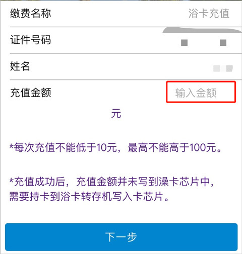 以浴卡充值为例,直接输入金额,点击“下一步”跳转到支付平台,支付成功即可