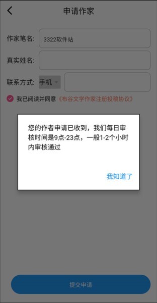 6、提交申请后,还需要等待审核,审核通过后就能成为布咕阅读的签约作者了。